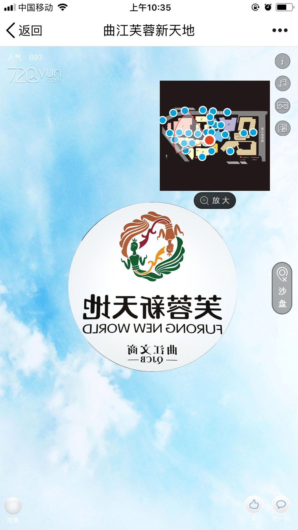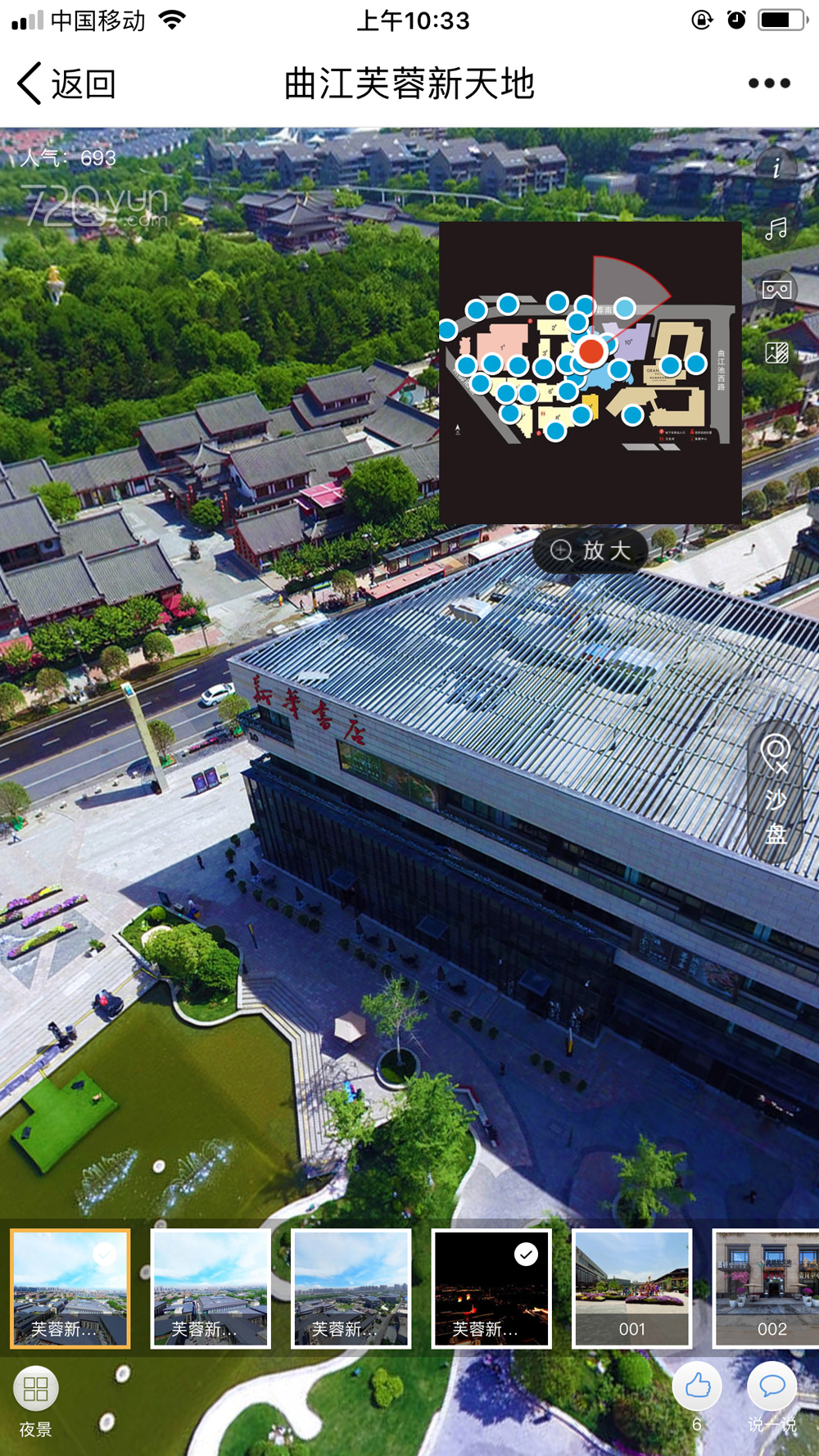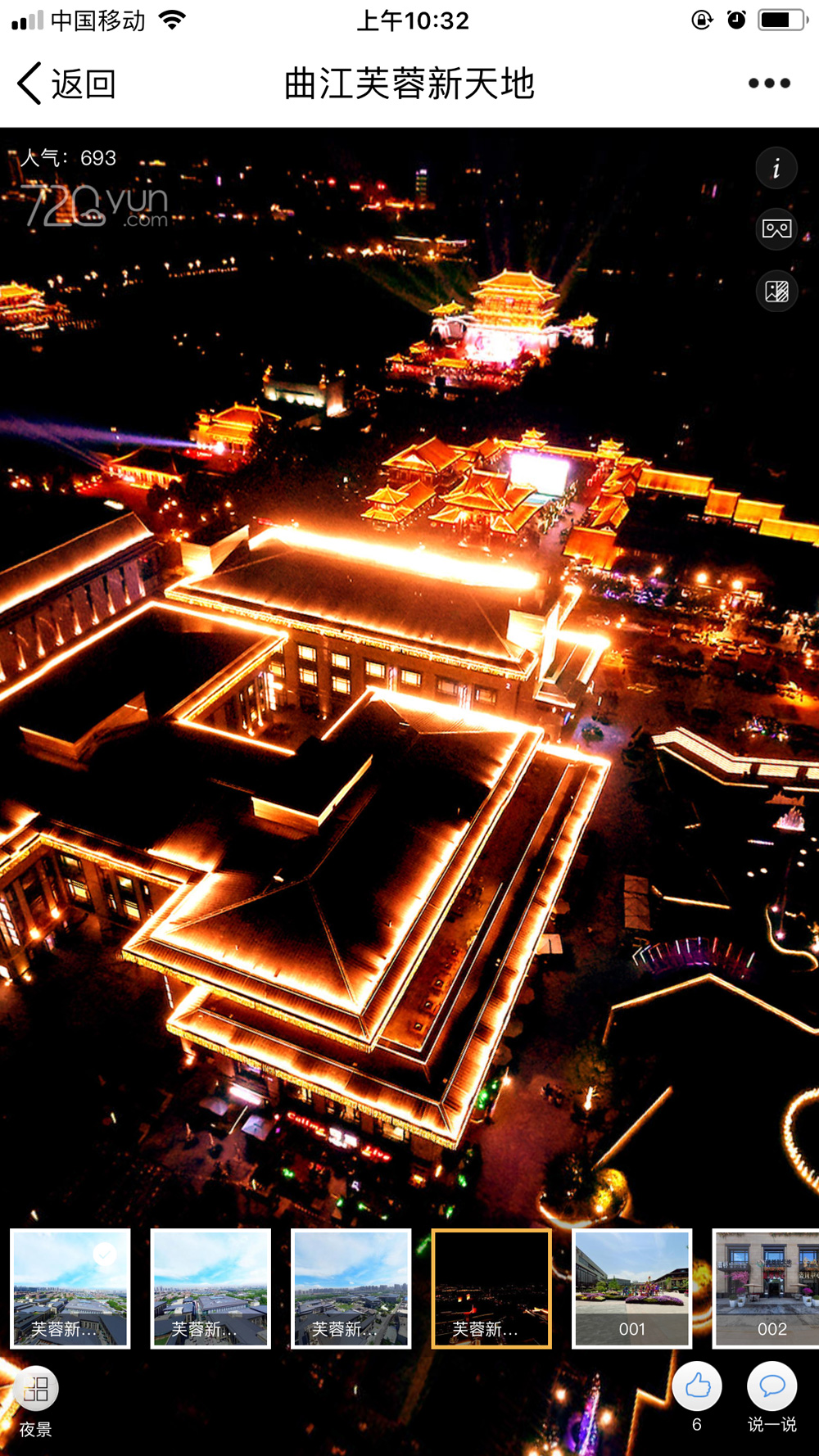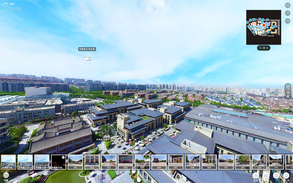 曲江芙蓉新天地720度实景漫游,采用航空拍摄加地面拍摄,结合最新VR技术,融合图片、视频、音频等多元素材,全方位720度立体展现曲江芙蓉新天地的实景风貌,让电脑或手机前的用户有身临其境的虚拟现实感,在互联网上广泛传播,最大程度地增加园区的品牌形象及曝光频率。
