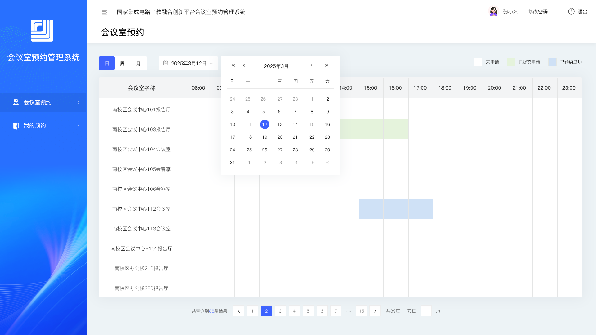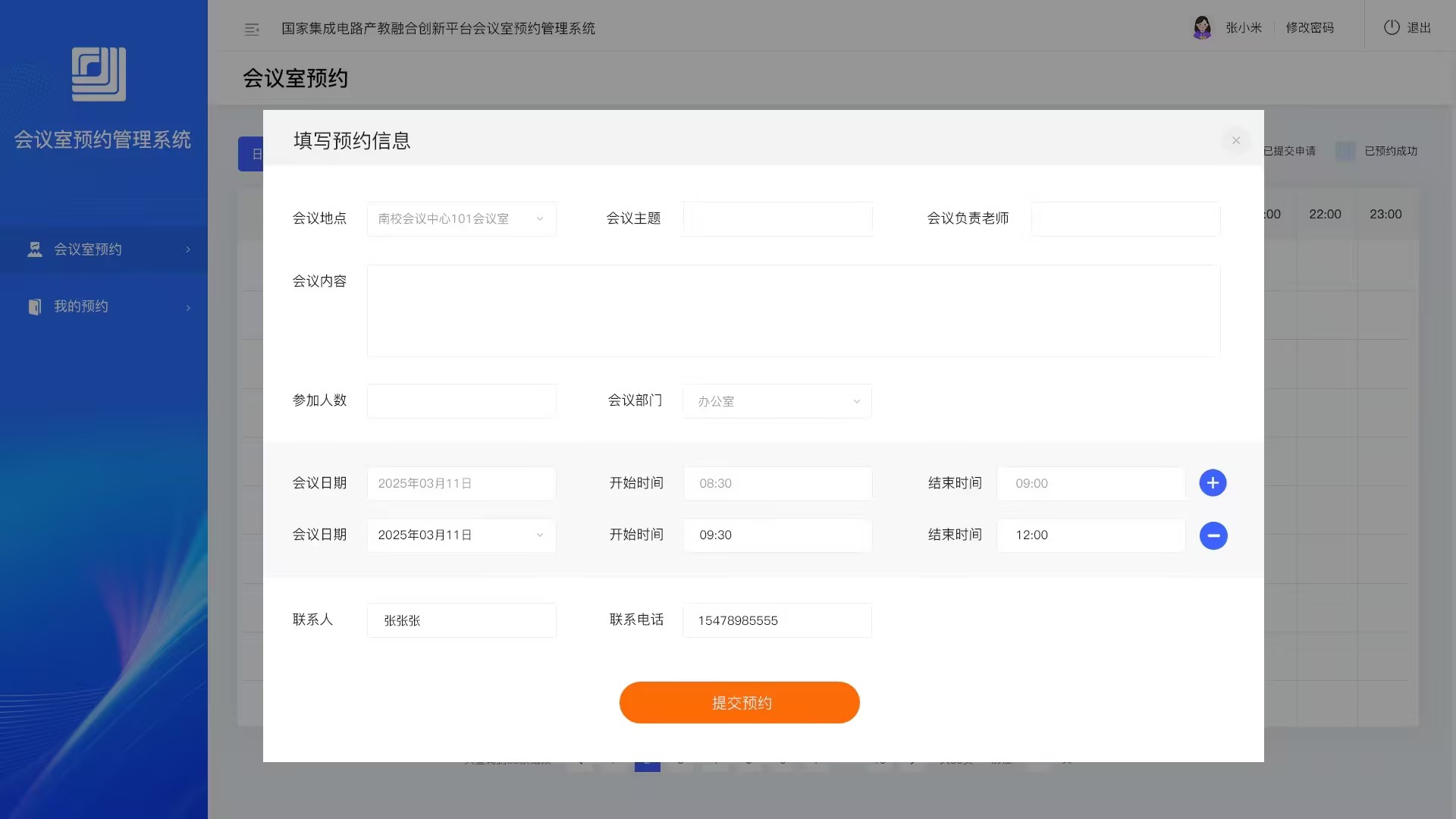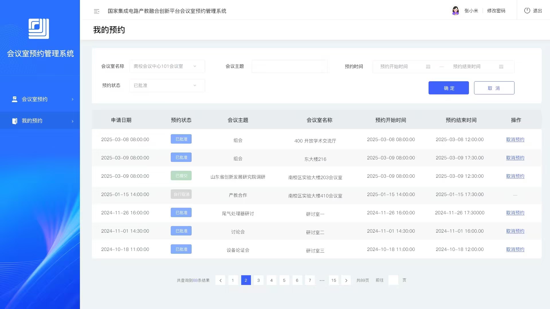 恭贺由【硅峰网络】设计开发的会议室预约系统上线啦! 西安电子科技大学国产教融合创新平台会议室预约系统主要服务于校内学生和教职工,系统支持用户在线预约(按日或周预约)、时间段查看、冲突提醒、审批管理、数据记录统计,节假日自动关停。一键搞定会议室使用,规范有序、高效便捷,让会议安排更省时省心~