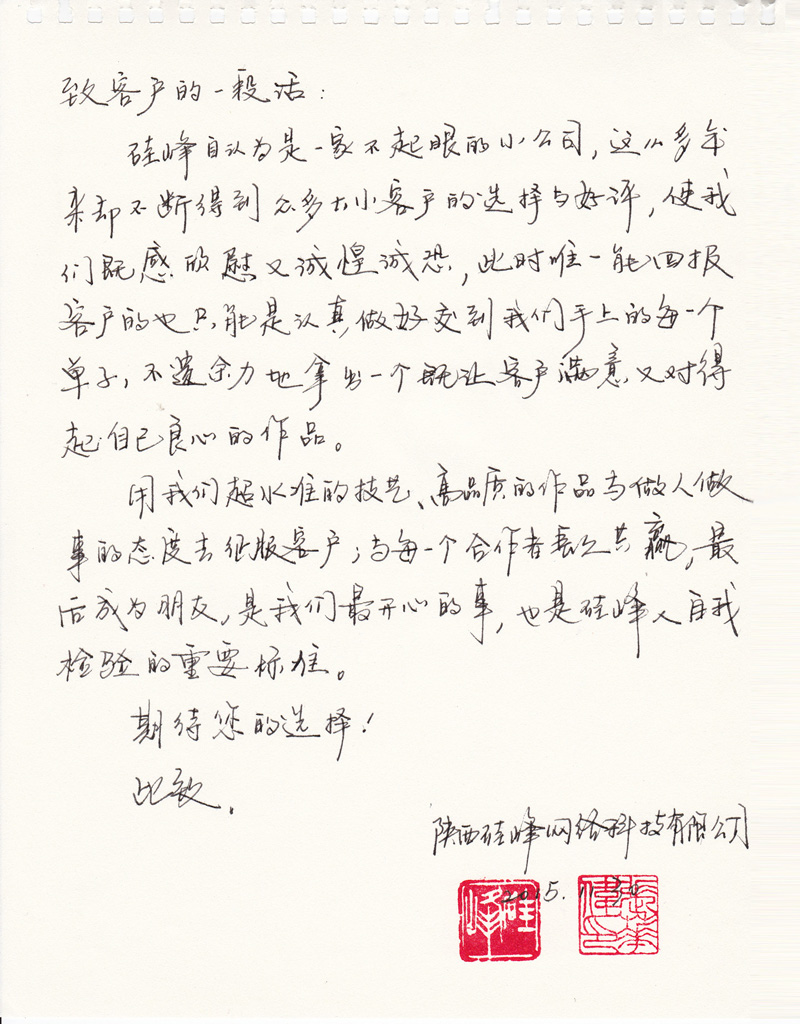 借着做公司宣传册之际,收集整理了一下这么多年客户对硅峰的评价,读着这些文字,给我的是感动和力量,硅峰只有再接再厉,拿出更好的作品来回报大家了,用实力赢得客户的口碑也是硅峰十几年赖以生存的唯一法宝。