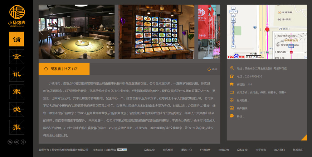 西安众和餐饮服务管理有限公司旗下知名品牌“小杨烤肉”以经营传统烧烤系列菜品为特色,以秦巴山区绿色农家的陕南家乡菜为亮点。长期以来,公司坚持以“健康、绿色、原生态”的产品理念;“为家人服务我愿意我快乐”的服务理念;“煮菜无人知,存心有天知”的出品理念。