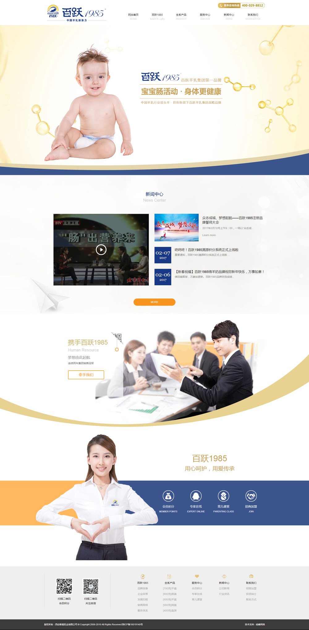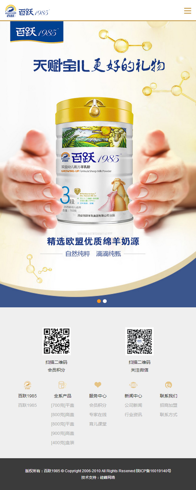 恭贺由硅峰设计制作的【百跃1985】品牌营销官网正式上线!西安新嘉鲜乳业有限公司旗下品牌百跃1985。上世纪1985年,一个平平凡凡的日子里,一位年轻的西北汉子——孟百跃,秉承着对“羊乳”的执念,让“中国万千宝宝吃上健康羊奶粉”的责任心,创造了百跃羊乳集团。