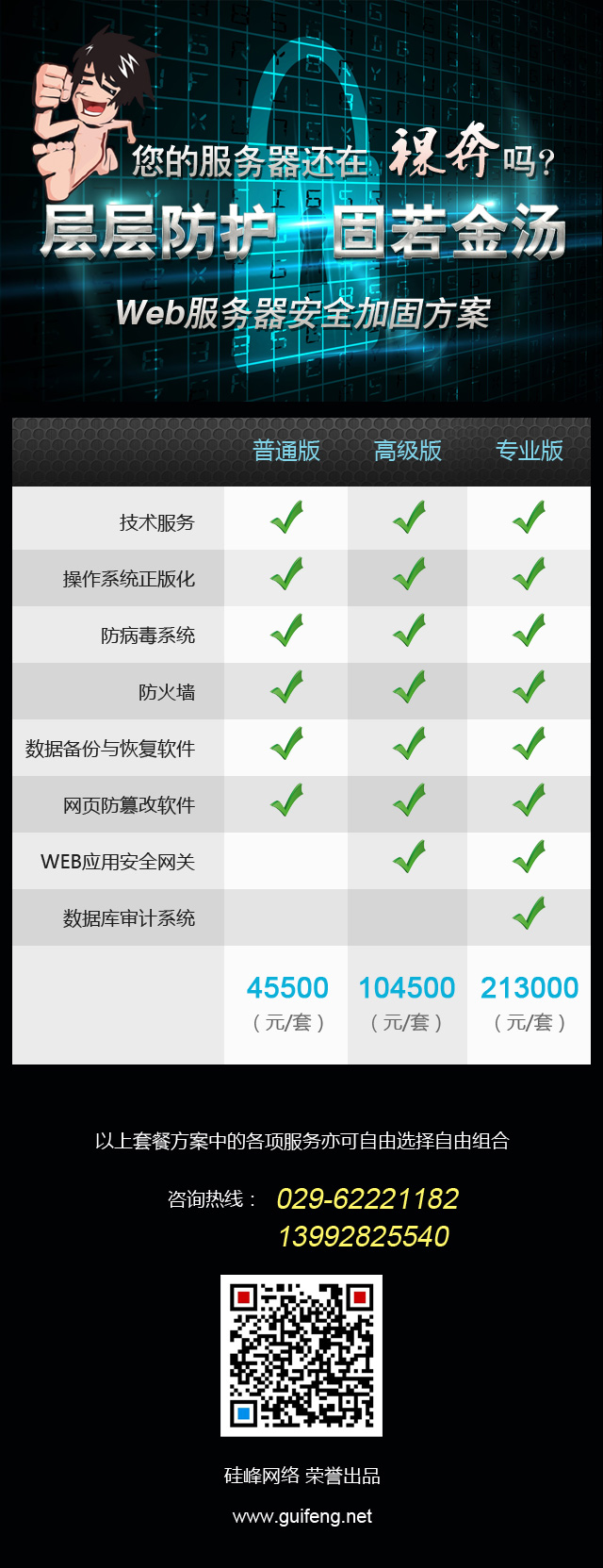 为更加确保网站信息的安全,硅峰网络面向拥有独立WEB服务器的新老客户提供服务器安全加固服务,层层防护,固若金汤!详细请咨询029-62221182或您的商务专员。